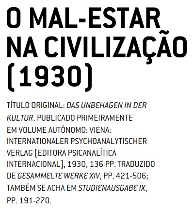 - FREUD, S. (1930): FREUD, Sigmund. O mal-estar na civilização. In: _______. Obras completas. Tradução: Paulo César de Souza. São Paulo: Companhia das Letras, 2010. v.18, p.9-89. Título original: Das Unbehagen in der Kultur. observação: Referência de pelo menos uma versão da Introdução do Relatório Final da pesquisa Como viver junto na cidade.