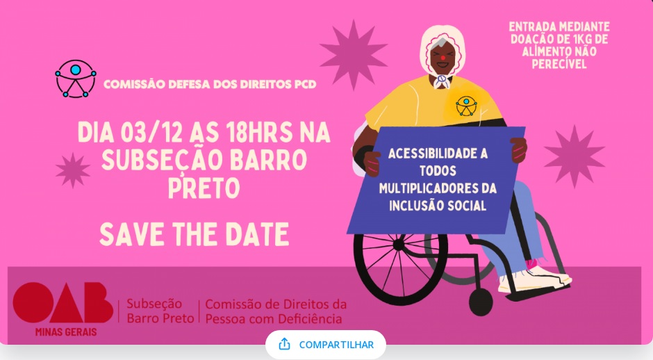 ⏰️ No dia 03 de dezembro, às 18h, a Comissão de Defesa dos Direitos da Pessoa com Deficiência da OAB Barro Preto em parceria com a Comissão Estadual: convidam você para um evento especial em celebração ao Dia Internacional da Pessoa com Deficiência.