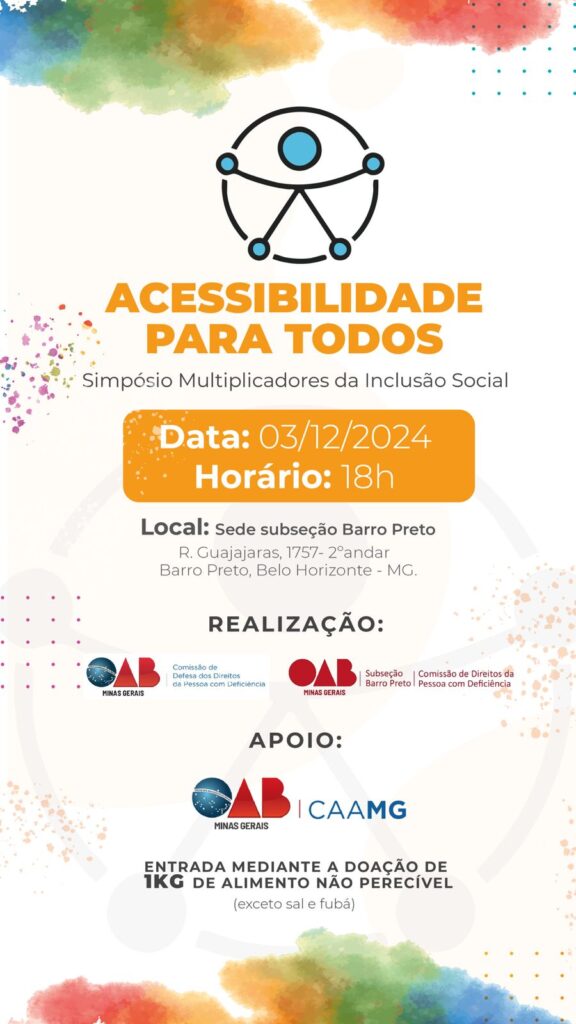 SIMPÓSIO (2024a): SIMPÓSIO MULTIPLICADORES DA INCLUSÃO SOCIAL, 1. 2024. Organização: Comissão de Defesa dos Direitos das Pessoas com Deficiência da Seccional Minas Gerais da OAB/MG (CDDPCD-OAB/MG) – evento presencial. Belo Horizonte, 3 dez. 2024. (cards).