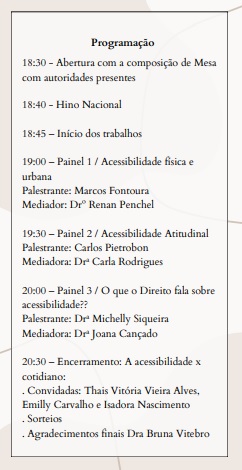 Com o tema “Acessibilidade para Todos: Multiplicadores da Inclusão Social”, este será um momento de reflexão, aprendizado e troca de experiências, reforçando a importância da acessibilidade adequada para todos os tipos de deficiência e quais seriam seus direitos.