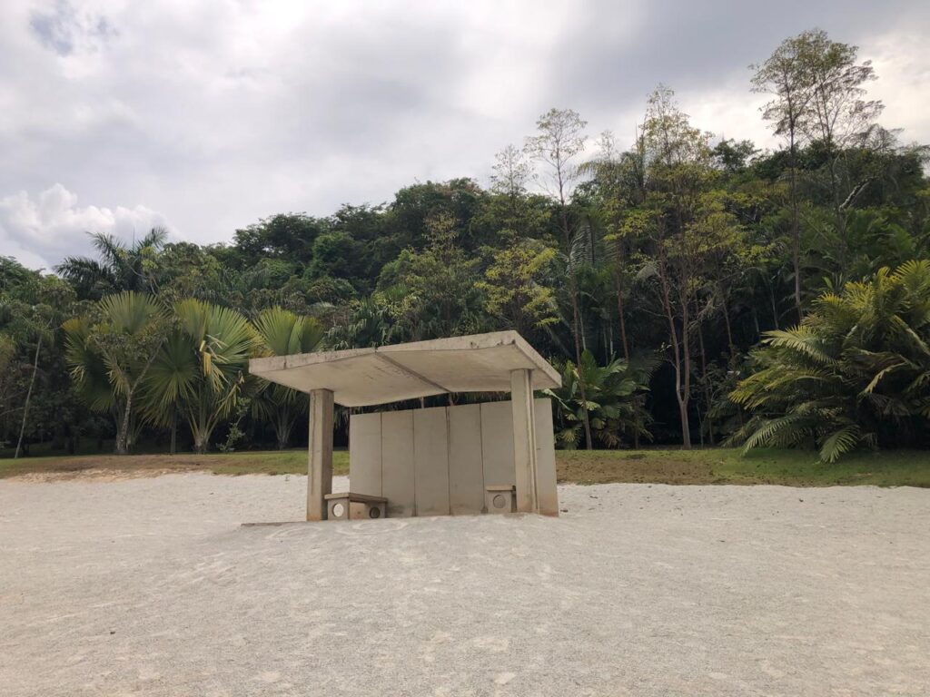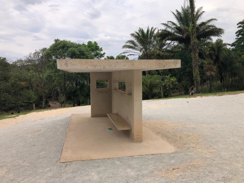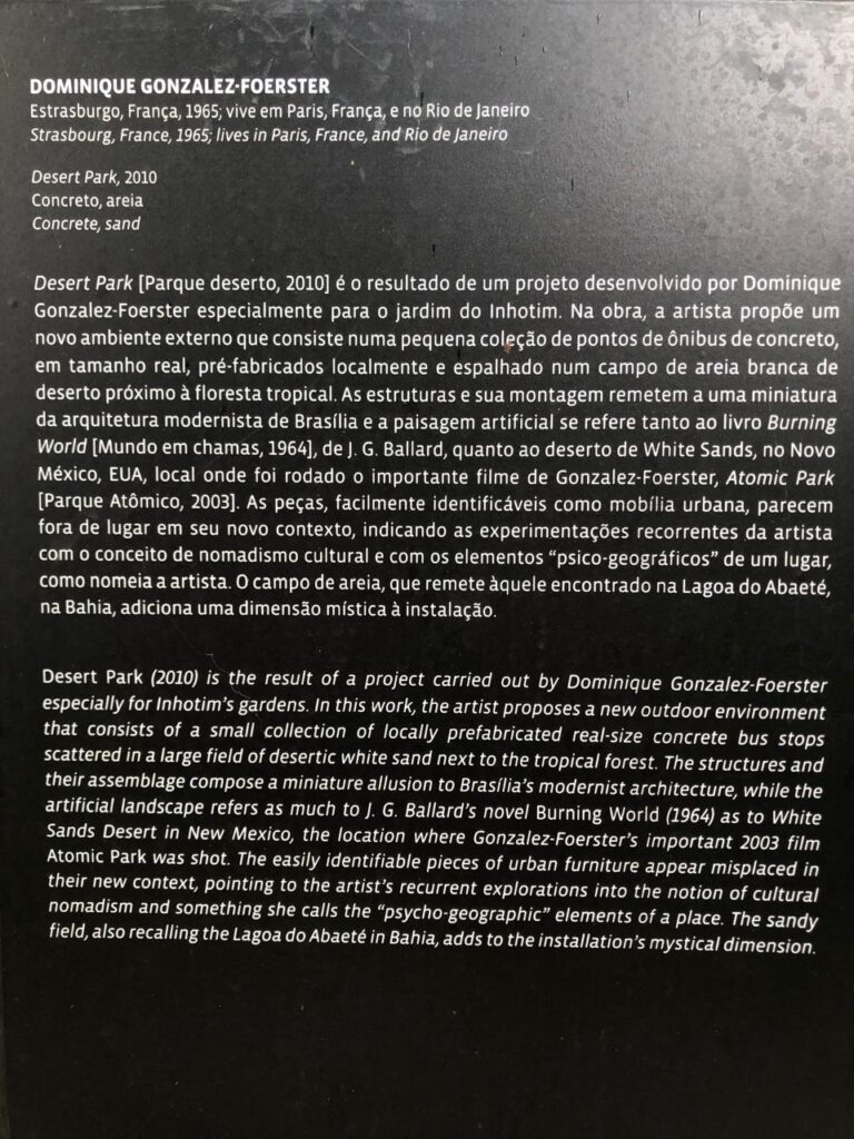 Ao contrário de muitas obras do Instituto Inhotim, que se integram à paisagem, Desert Park (2010) foi idealizada para ser, intencionalmente, um elemento destoante. Ela reúne uma pequena coleção de diferentes tipologias de abrigos de ônibus, feitos de concreto e em tamanho real, pré-fabricados localmente.