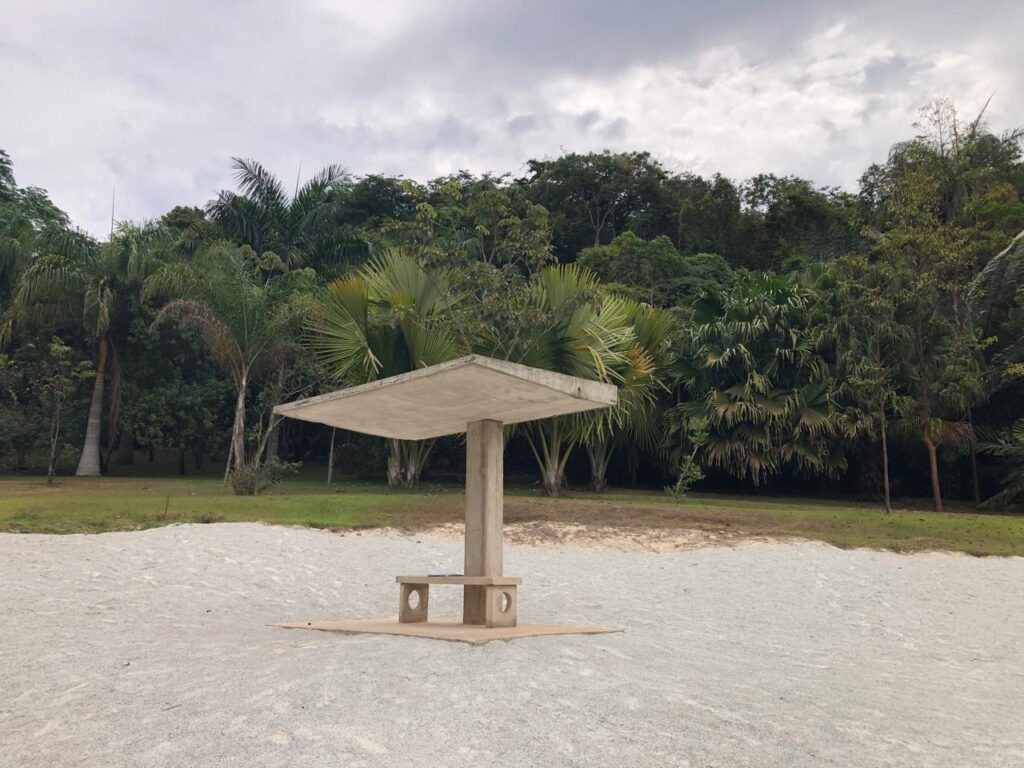 A artista se apropria de uma referência importante do mobiliário urbano modernista do período entre 1940 e 1960. A área dessa espécie de praça é coberta por areia branca, criando um cenário artificial, desértico.