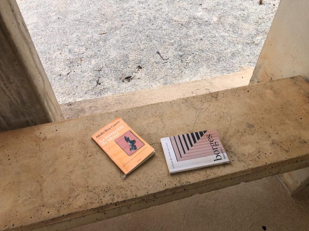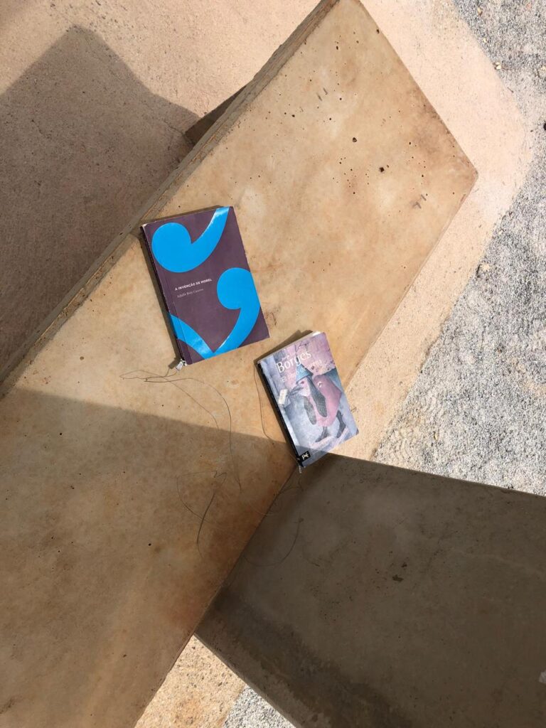 Sobre os bancos dos abrigos, alguns livros aguardam os visitantes (no website no Inhotim – acesso em 20/20/2025 – os livros mostrados são outros: “The Misfits” de Arthur Miller, “2666” de Roberto Bolaño, “Ask the Dust” de John Fante):
