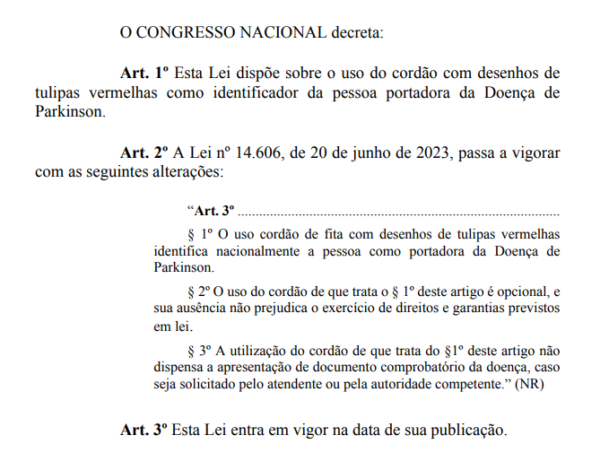 BRASIL (2024h): BRASIL. Senado Federal. Projeto de Lei n.° 4366, de 13 de novembro de 2024. Altera a Lei nº 14.606, de 20 de junho de 2023, que dispõe sobre a conscientização sobre a Doença de Parkinson, para instituir o uso do cordão com desenhos de tulipas vermelhas para identificação de pessoas portadoras da Doença de Parkinson. Acompanha: Justificação. Diário do Senado Federal – DSF, Brasília, 14 nov. 2024. Disponível em: link externo. Acesso em: 28 jul. 2025.