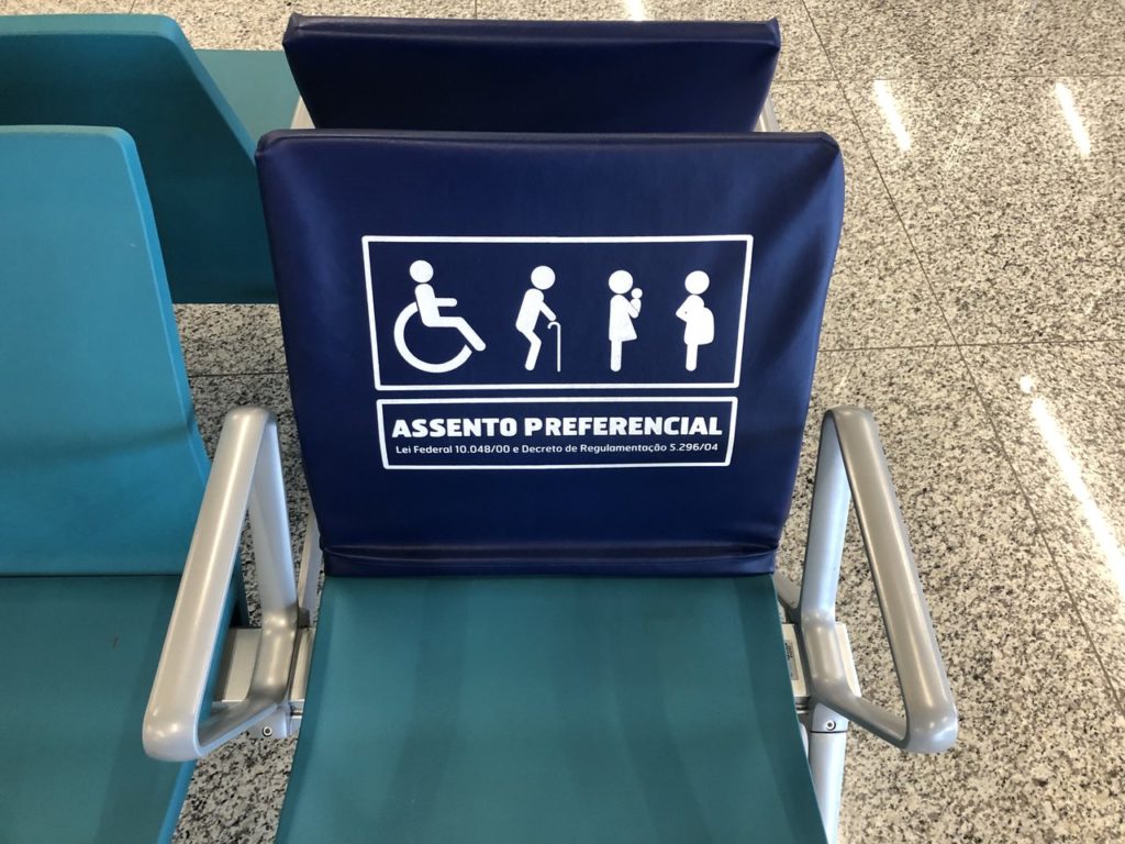 observe-se nessa fotografia que os quatro (todos) assentos existentes junto à fila do atendimento prioritário estão identificados como preferenciais