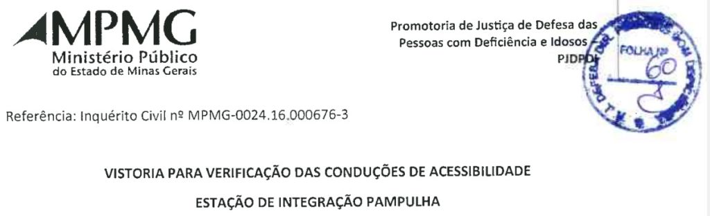 - MPMG (2022a2): MINAS GERAIS. Ministério Público do Estado de Minas Gerais – MPMG. Promotoria de Justiça de Defesa dos Direitos das Pessoas com Deficiência – PJPD. Relatório “Vistoria para verificação das condições de acessibilidade -Estação de integração Pampulha”. Belo Horizonte, 25 nov. 2021. 9p. In: _______. Ofício n.º 071/2022-PJPD [à BHTrans encaminhando relatório de vistoria na Estação Pampulha e solicitando “manifestação”]. Belo Horizonte, 14 fev. 2022. 1p. +anexo (9p.).