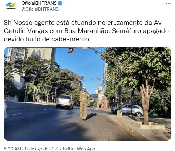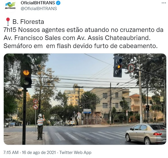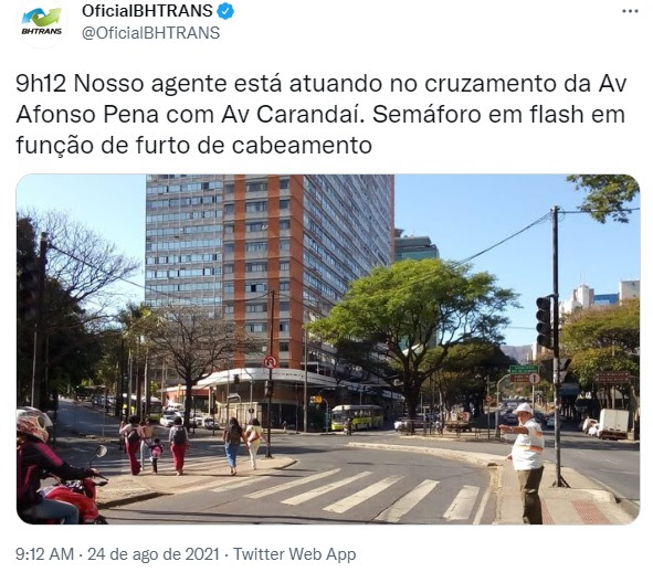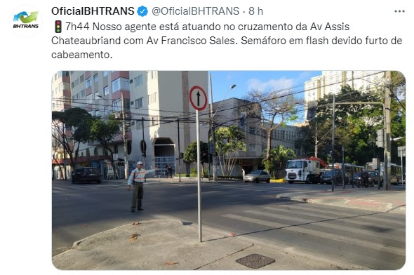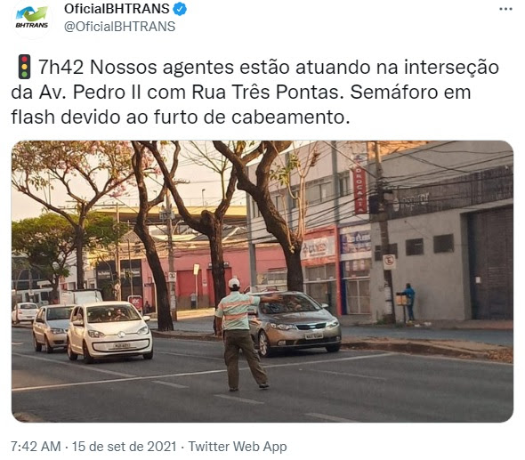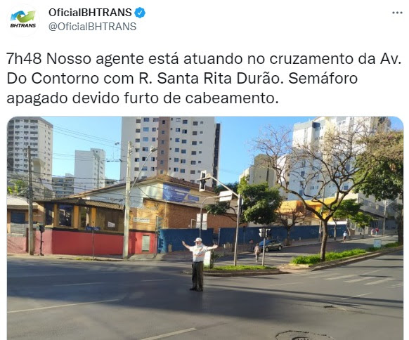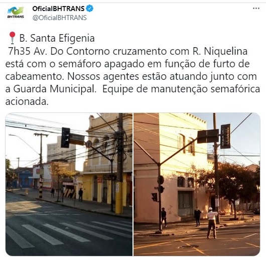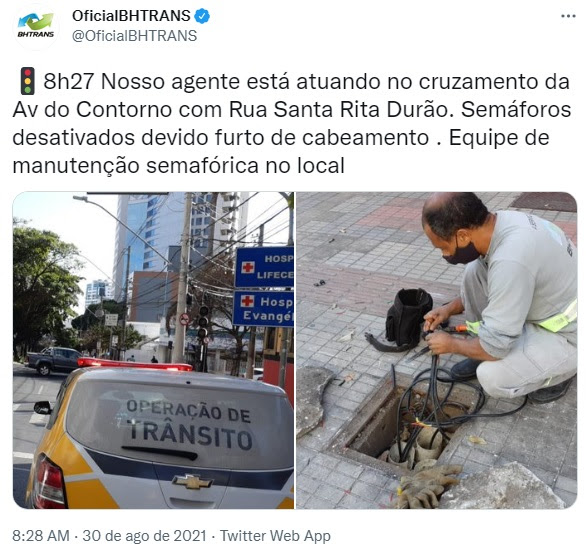 4 nov. 2022: O Circulando da BHTrans(arquivo “BHTRANS_2021f1104-circulando), na matéria “Troca do material reduz número de furtos de cabos dos semáforos de BH” informa que “A troca de cobre da rede de semáforos por fios sem atratividade comercial levou a uma redução de mais de 90% nas ocorrências de furtos de cabos em Belo Horizonte. A medida começou a ser adotada pela Prefeitura em maio deste ano. Se em abril a BHTrans registrou 173 ocorrências de furtos de cabos nos semáforos, em setembro o número caiu para 16”.