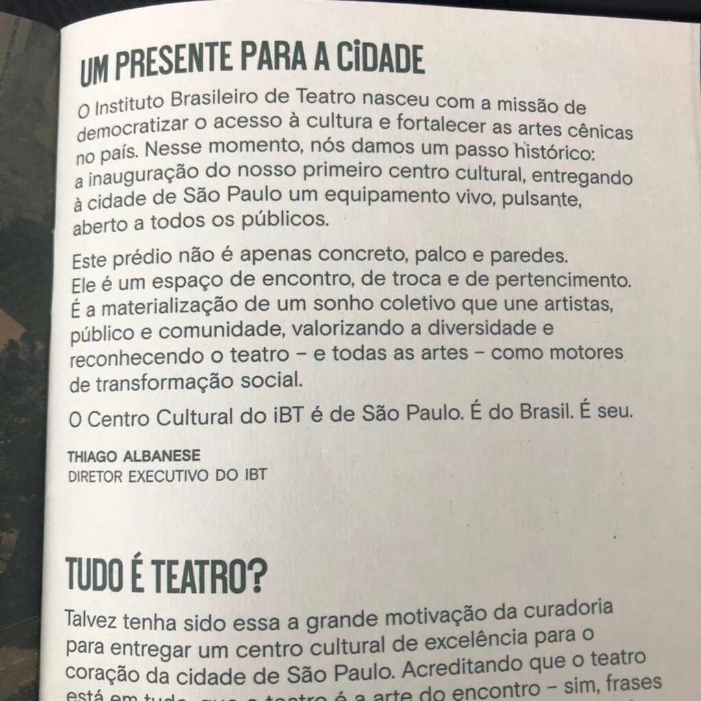Na primeira página da “agenda ago & setembro 2025” lemos palavras estimulantes de Thiago Albanese, diretor executivo do iBT, afirmando que o prédio é “primeiro centro cultural” do IBT, um equipamento “aberto a todos os públicos” como “um presente para a cidade”.